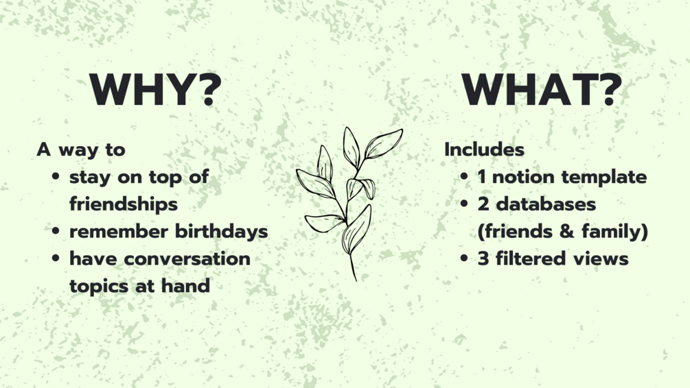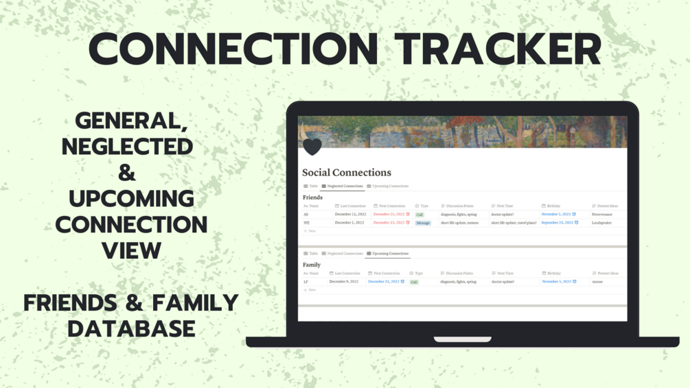 This Social Connections Tracker Notion Template is for those who leave people on-read, forget friends' birthdays, and never give family members presents.